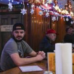 Shane Clark, 27, of Unity talks about his dinner plans as he and other regulars sit at the bar at Monday’s Union Restaurant in Unity on Tuesday, Dec. 10, 2024 as the establishment reopens following a sinkhole accident behind the property last week. Elizabeth Pollard was looking for a cat last Monday evening when the ground gave way under her and she fell into a sinkhole that opened into an abandoned mine. The 64-year-old Unity resident died.