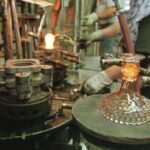 A decorative glass piece can be seen at the L.E. Smith Glass Company plant in Mt. Pleasant after just having been taken from the mold that formed it in this 1999 file photo. The glass is still glowing from the heat and can be seen sitting between jets of air that help cool it down.
