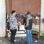 Mt. Pleasant Area High School senior Jason Cramer learns about a type of glass at the closed L.E. Smith Glass plant from former plant employee Don Sechrist during an October 2023 visit to the Mt. Pleasant site.