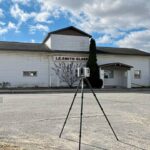 A device is set up to complete an exterior digital scan of the closed L.E. Smith Glass plant during an October 2023 visit by local school students to the site in Mt. Pleasant.