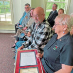 Relatives of Congressional Medal of Honor recipient and Ligonier High School graduate Staff Sgt. Alvin P. Carey view a framed copy of state legislation naming a Ligonier Township bridge for him and a fellow Ligonier-area recipient of the medal. At right, Donna Jones of Ligonier Township, whose father was a cousin of Carey, was among those participating in the bridge dedication ceremony on Saturday, May 11, 2024, at Ligonier Valley Cemetery, where both honorees are buried.