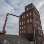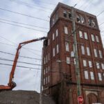 Contractor GEMM Demolition constructed a ramp for heavy machinery to reach the upper part of the building that once housed brewery equipment. That machinery easily ripped apart a top portion of the tower Friday as work got underway.