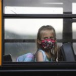 A student looks out a bus window as she arrives for classes on the first day of school at Penn-Trafford School District’s McCullough Elementary on Thursday, Aug. 27, 2020.