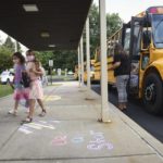 A student walks over chalk messages as he arrives for classes on the first day of school at Penn-Trafford School District’s McCullough Elementary on Thursday, Aug. 27, 2020.