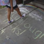 A student walks over chalk messages on the first day of school at Penn-Trafford School District’s McCullough Elementary on Thursday, Aug. 27, 2020.