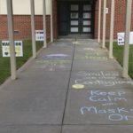 Chalk messages decorate the sidewalk on the first day of school at Penn-Trafford School District’s McCullough Elementary on Thursday, Aug. 27, 2020.