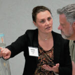 Ashley Brehm, Environmental Sciences Department manager for PennDOT consultant The Markosky Engineering Group, uses a map to explain proposed Route 30 improvements to a visitor on Thursday, May 9, 2024 at the Hartford Heights fire station in North Huntingdon.