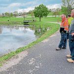 Using a pitchfork and some of his son-in-law Jimmy Rudick’s homemade tools of wood, pool noodles and rake parts, Bob Sturn cleared algae and debris from the park pond Friday morning ahead of a fishing derby set for Sunday that is held in memory of his grandson, Carson Rudick.