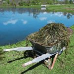 A wheelbarrow of plant debris rests on the bank of the fishing pond at Penn Township Municipal Park on Friday. Bob Sturn of Penn Township, grandfather of Carson Rudick, was clearning the pond ahead of this Sunday’s fishing derby in Carson’s memory. A team of volunteers and public works employees helped throughout the week.