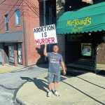 A lone anti-abortion protester, Dan Rullo, 44, of Norvelt said he wanted to express the other side of the argument, holding up a sign stating “Abortion is Murder,” with the word “murder” written in red.