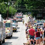 Crowds watch as fire departments parade down Kecksburg Road on Saturday, July 23, 2022 for the Kecksburg UFO Festival.