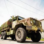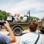 Military vehicles parade through Kecksburg Road on Saturday, July 23, 2022 in Kecksburg for the Kecksburg UFO Festival.