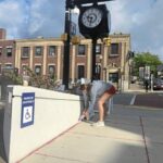 Anna Rafferty, 20, of Latrobe, who along with her Seton Hill University women’s basketball teammates, volunteered to fill the cracks Saturday around the courthouse and at the Westmoreland County Transit Authority headquarters.