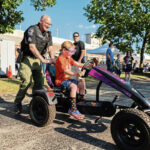 Latrobe Police Sgt. Ron Keslar helps Cullen Notto, 8, use a four-wheel pedal bike to steer through an obstacle course while wearing “drunk goggles,” to create impaired vision during a demonstration of DUI Taskforce and what it’s like driving under the influence, during Latrobe Police Department’s National Night Out on Thursday, Aug. 22, 2024, at Memorial Stadium in Latrobe.
