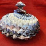The nearby Jeannette Area Historical Society has preserved several examples of Westmoreland glass, including a lidded dish in an English hobnail pattern. The dish features a swirled combination of purple, blue and white “slag glass,” which was left over at the end of the working day.