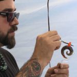 Moon Township glass artist Dan Sullivan uses a metal implement to smooth the edges of a red-hot suspension ring atop an organic-shaped glass pendant Sunday, Sept. 30, 2018, at the Mount Pleasant Glass and Ethnic Festival in Mount Pleasant Borough.