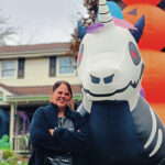 That’s thanks to a giant inflatable unicorn skeleton — complete with rainbow mane and tail — that is merely the centerpiece of her front yard decorating scheme, which includes more than 25 features ranging from a skeleton flamingo to a couple of creepy dolls on a rickety swing.