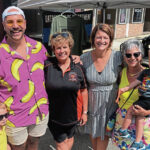 From the left, Lincoln Connelly, 4, Matt Hauser of Pittsburgh, Beth Straka of the Latrobe Police Department, Latrobe City Councilwoman Ann Amatucci, Anita Hauser of Latrobe and Edison Connelly, 2, post for a photo at the Great American Banana Split Celebration on Saturday, Aug. 26, 2023, in downtown Latrobe.