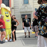 Lee Intachi of Latrobe, on the right, poses for a photo with a Great American Banana Split Celebration staffer and festival mascot Bobby Banana on Saturday, Aug. 26, 2023, in downtown Latrobe.