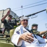 U.S. Navy veteran Duane V. Myers, 95, of Armbrust, wearing his dress whites uniform, smiled and waved to the crowd. He served during the Korean War on an underwater demolition team, known as “frogmen,” and said he did espionage work. In 1951, he survived an ambush in North Korea and was awarded a Purple Heart.