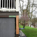 A sign that reads “River House” is tacked to the porch of Rich Boyd’s West Newton home on Thursday. Boyd said he just put the sign up after the flooded Youghiogheny River spilled into his basement and garage.