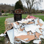 A pile of drywall and what was a brand new electric fireplace sit in the yard of Paul and Brenda Hermann’s home in the Lowber neighborhood of Sewickley Township as the couple cleans up from flooding Thursday.