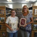 Youngwood Borough Manager Diane Schaefer (right) and assistant Shannon Moore hold books pertaining to the town’s history inside the library Thursday, Aug. 22, 2024.