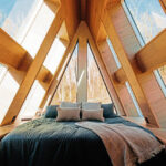 At the very top of the A-frame, guests can lie on the loft’s king-size bed and survey the heavens through four of the 22 skylights positioned throughout the house.