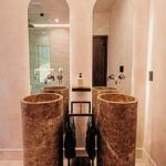 One of the unique bathroom features is a set of twin pedestal sinks backed by 6-foot mirrors. “They were carved out of a huge block of granite,” he said of the pedestals.