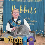 Nora Roland, 9, of North Huntingdon, poses with her fermale English Lop rabbit Ophelia, which won a Best of Breed riibbon at the 2024 Pennsylvania Farm Show in Harrisburg.