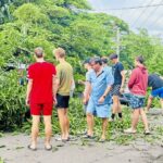 At one point, many of the students jumped out of the bus to help clear away a fallen tree that was blocking the road.