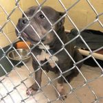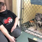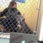 For Thursday’s session, Brisbane and volunteer Jeanne Shaffer of Greensburg put a laptop in front of Phoebe, an American bulldog that has been in the shelter since Feb. 21.