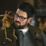 Disneyland employee Julia Millard wears a Kowakian monkey-lizard toy during the Star Wars: Galaxy’s Edge Media Preview at Disneyland Park, Wednesday, May 29, 2019, in Anaheim, Calif.