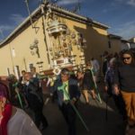 In this Saturday, Sept. 27, 2019 photo, villagers walk during an afternoon procession in Mayorga, northwest Spain. The procession of El Vtor, as locals refer to the festival, celebrates the night when the remains of a celebrity missionary from the 16th century, Toribio Alfonso de Mogrovejo y Robledo, returned to the wind-swept Spanish town.