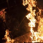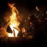 In this early Sunday, Sept. 28, 2019 photo, a villager lights on fire a leather wineskins during the procession of El Vtor in the town of Mayorga, northwest Spain. The procession of El Vtor, as locals refer to the festival, celebrates the night when the remains of a celebrity missionary from the 16th century, Toribio Alfonso de Mogrovejo y Robledo, returned to the wind-swept Spanish town.