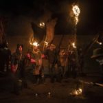 In this early Sunday, Sept. 28, 2019 photo, villagers take part in the procession of El Vtor in the town of Mayorga, northwest Spain. Yielding burning wineskins as torches, neighbors of Mayorga, in northwestern Spain, have been marking for more than three centuries the night when the remains the local saint returned home.