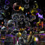 A woman looks at the disco and Christmas balls illuminated with lights hanging on a decoration display for the upcoming Christmas Festival at a popular outdoor shopping mall in Beijing, Wednesday.