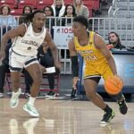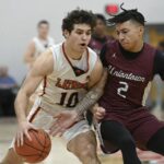 Latrobe’s John Wetzel works against Uniontown’s Calvin Winfrey during their game on Tuesday, at Greater Latrobe.