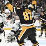 The Penguins’ Sidney Crosby and Rickard Rakell celebrate Matt Grzelcyk’s game-tying goal against the Kings in the third period on Tuesday at PPG Paints Arena.