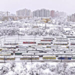 An aerial view of parked trolley buses during heavy snowfall in Sarajevo, Bosnia, on Tuesday.