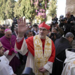 Latin Patriarch Pierbattista Pizzaballa, the top Catholic clergyman in the Holy Land, center, waves as he arrives at the Church of the Nativity, traditionally believed to be the birthplace of Jesus, on Christmas Eve in the West Bank city of Bethlehem, on Tuesday.