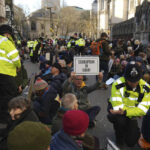 Police officers talk to climate activists as protesters block the road outside The Royal Courts of Justice in support of 16 climate activists who are at the high court to appeal against jail sentences, in London, Thursday.
