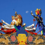 The moon is pictured behind one of the eight Chhoepi Lhamo Gye (or eight offering goddesses) and the main Kalachakra statue in the festival’s mandala, on the day of a session led by Masters of Karma Kagyu tradition, at the Global Peace Prayer 2025 in Thimphu, Bhutan, on Sunday.