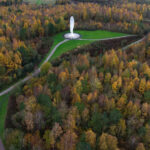 A drone view of the Dream Sculpture surrounded by trees displaying their Autumn colours near Saint Helens, Britain, on Monday.