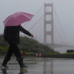 A pedestrian carrying an umbrella walks in front of the Golden Gate Bridge in San Francisco, Wednesday.