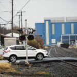 A motorist crosses the railroad tracks on Morgan Street in Brackenridge on Wednesday.
