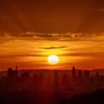 The sun rises behind buildings of the banking district in Frankfurt, Germany, Monday.