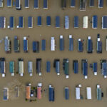 Caravans at Billing Aquadrome Holiday Park are surrounded by floodwaters brought by Storm Bert in Northampton, England, Monday.