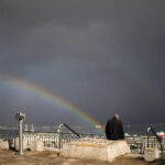A double rainbow stretches across the sky as a man sits at a promenade overlooking Haifa, Israel, Tuesday.