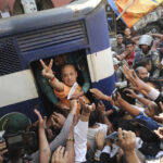 Bangladeshi Hindu leader Krishna Das Prabhu shows a victory sign as he is taken in a police van after court ordered him detained pending further proceedings in Chattogram in southeastern Bangladesh, Tuesday.